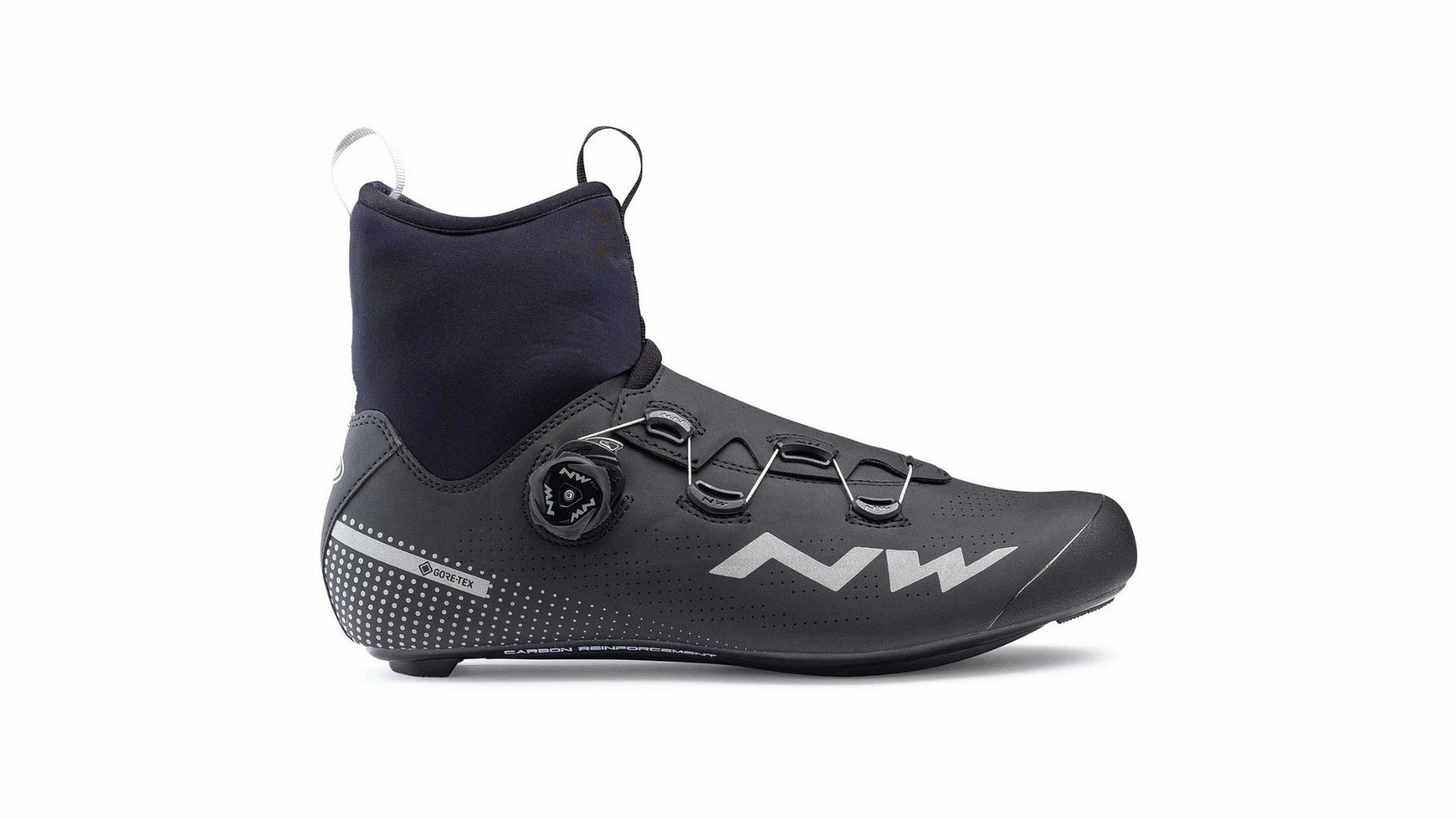 Der Northwave Celsius R GTX ist ein Rennradschuh für mildes Winterwetter. Die Pique GORE-TEX Membran hält den Fuß verlässlich isoliert und trocken, der Zehenbereich wird duch zusätzliches Futter geschützt. Die carbonverstärkte Jaw Sohle (Steifigkeitsindex 8) sorgt für perfekte Kraftübertragung.