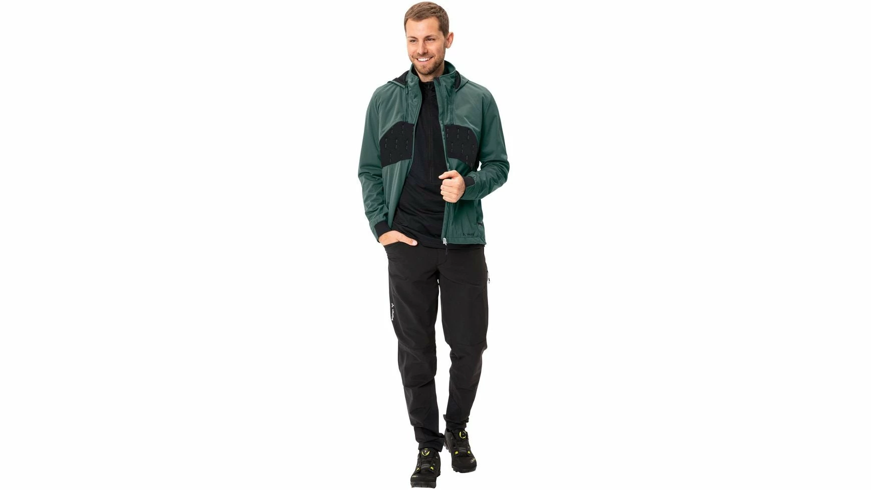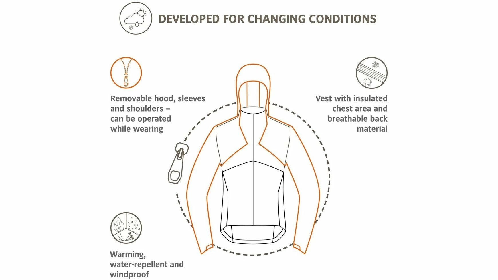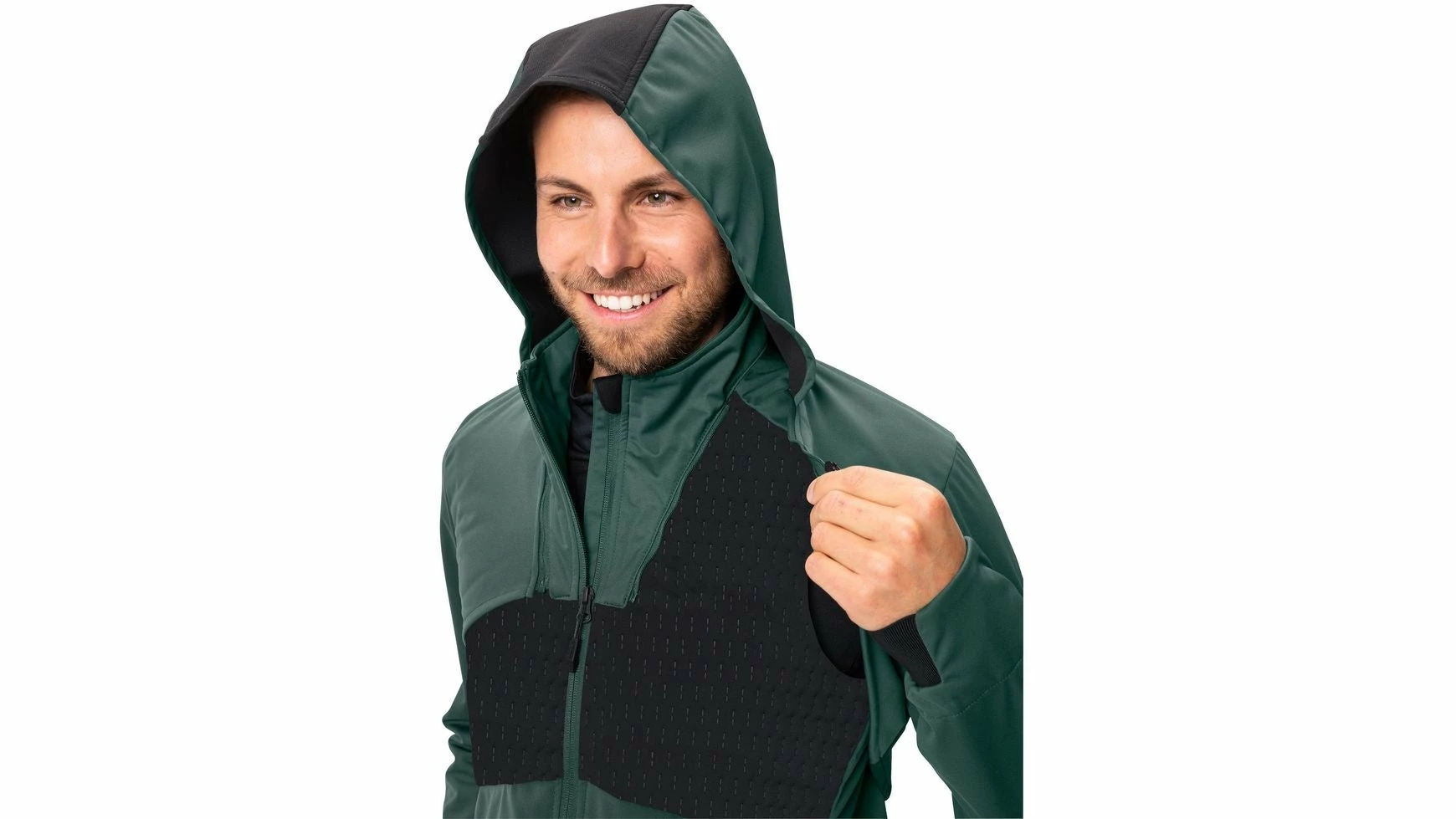 Cooler Verwandlungskünstler! Gerade in den Übergangszeiten ist zuverlässiger Wetterschutz die Voraussetzung für unbeschwerte Tagestouren auf dem MTB. Mit dieser wandelbaren Hybrid Softshelljacke mit leichter Wattierung ist VAUDE einzigartig am Markt. Ist es am Morgen kühl, wärmt der Verbund; steigen die Temperaturen, ist das schön ins Design integrierte Add-on schnell und einfach unterhalb des Kragens abgezippt und im Rucksack verstaut. Eine Weste bietet nun die nötige Wärme. Wird es abends frisch, ist das Add-on eben so schnell wieder angezippt. Bei Pausen am Berg bringt die Kapuze ein Plus an Wärme.
