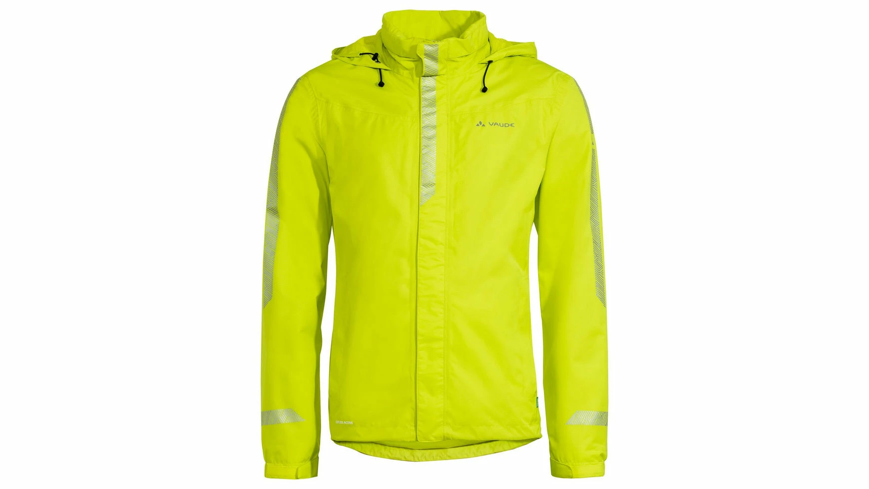 Permanenter Regenschutz mit großflächigen, reflektierenden Elementen. Die leichte 2 Lagen-Regenjacke mit dünnem Netzfutter ist mit Ceplex Active sehr atmungsaktiv und schützt zuverlässig vor Nässe und Wind. Die Reflexelemente erhöhen die Sicherheit im Verkehr deutlich, da man gerade bei widrigen Verhältnissen um wertvolle Sekunden früher gesehen wird. Die Kapuze kann aufgerollt im Kragen verstaut werden. Der 2 Wege Frontreißverschluss, weitenregulierbare Ärmelbündchen und 2 Fronttaschen mit Reißverschluss runden dieses Sicherheitspaket komfortabel ab. Dieses Produkt ist mit Eco Finish umweltfreundlich wasserabweisend ohne Fluorcarbone (PFC) hergestellt. Das VAUDE Green Shape-Label steht für ein umweltfreundliches, funktionelles Produkt aus nachhaltigen Materialien.